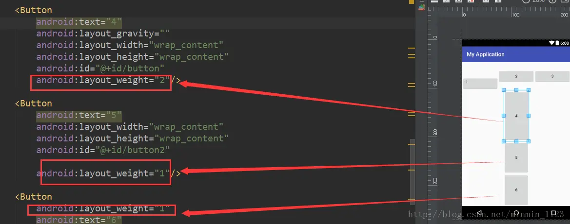 最后再介绍一个局部属性 android:layout_weight,是指子类控件占当前父容器的比例,比如下图显示的button4占两份,button5和button6各占一份,那么它们的高之比就是2:1:1,但注意成立的条件是它们的高选值是wrap_content,如果是match_parent,那就成反比了。