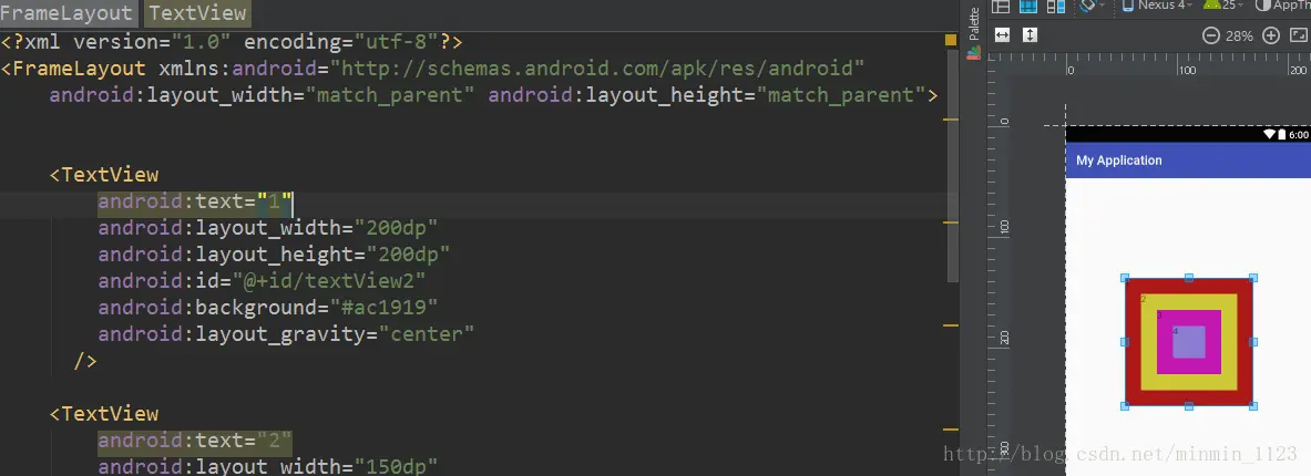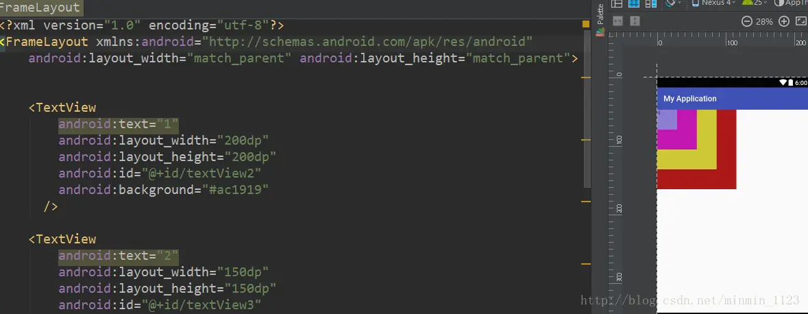 帧布局是所有子控件均放在左上角且后面元素直接覆盖在前面元素之上。两个常用属性:android:foreground(设置改帧布局容器的前景图像,前景图像是永远处于帧布局最上面的图像,就是不会被覆盖的图片) android:foregroundGravity(设置前景图像显示的位置)。为更直观,下图里展示的TextView都填充了颜色,可以看出textView4在最上面。