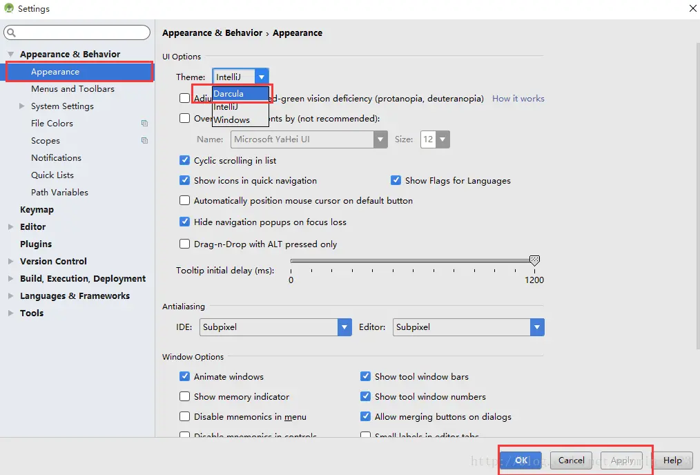 3.快捷键ctri+alt+s 可快速打开设置settings,里面有很多常用的功能。 比如主题更改:在Appearance&Behavior选项卡下的appearance->Theme->Darcula;