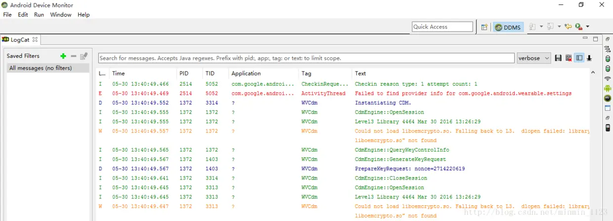 4.Logcat是用来获取日志信息的工具,可获取的信息包括Dalvik虚拟机信息、进程信息、Android运行时信息、以及应用程序信息。我们可以通过添加程序日志的方式来对程序进行简单的追踪,它是一种比较轻便简洁的调试方式。