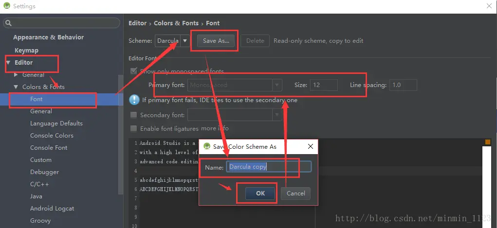 再比如希望代码界面字体大小更大更好看一些:在Editor选项卡下的Font里给的Darcula主题默认字体是不能更改的,这时候需要我们自己save as自定义一个,然后就可以去修改字体大小和样式了。