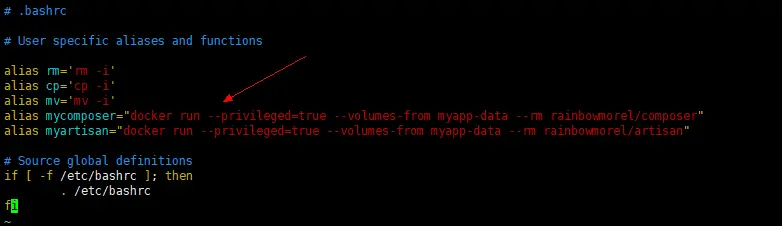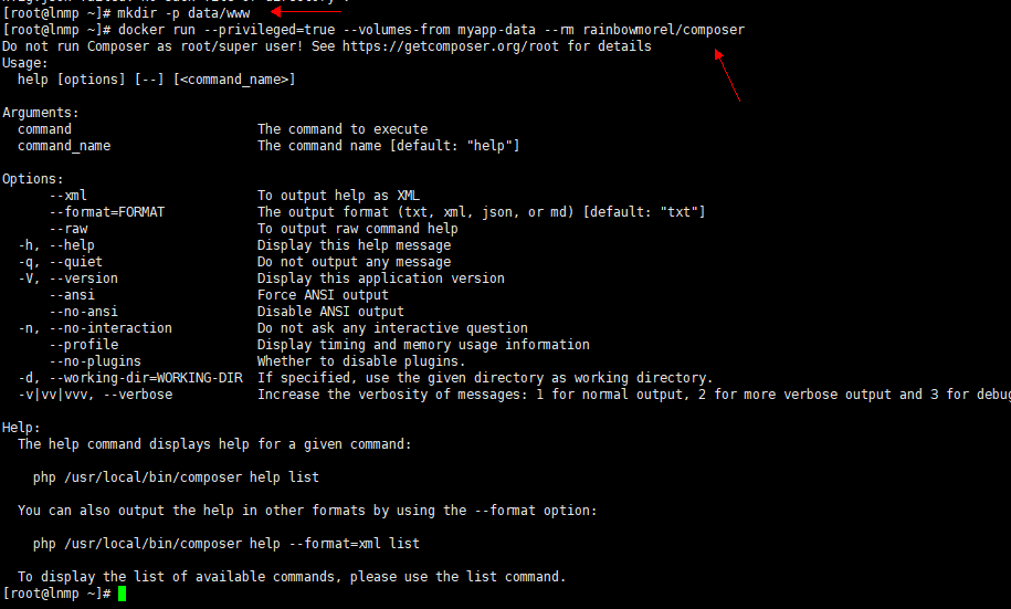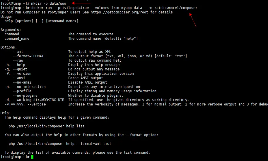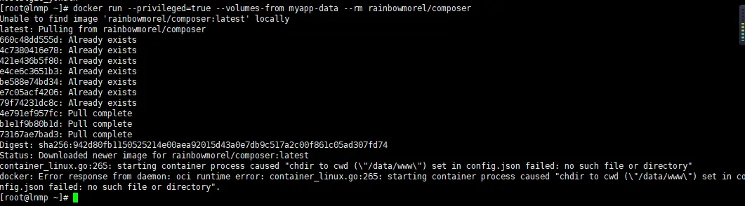 docker run --privileged=true --volumes-from myapp-data --rm rainbowmorel/composer