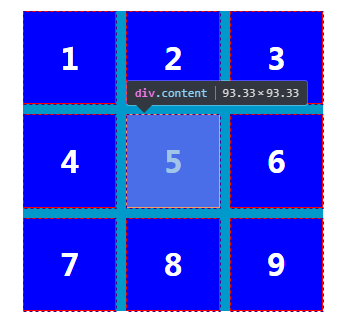 修改代码以后的页面, 可以看得出来, 子div的宽高都变为了平均的100px; 效果如下图: