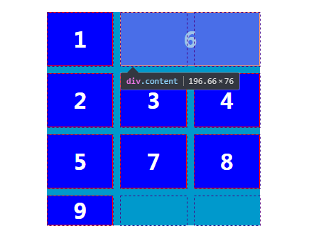 当我们改变了移动后的结束值时, 也就是此时6号div 在列的"坐标轴"相当于是占用了两个单位的宽度, 在chrome审查元素模式下,看起来很明显, 6号占了两个小方块的位置; 效果如下图:
