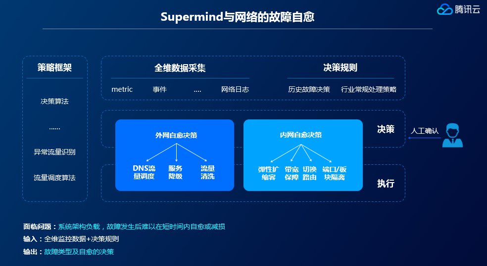 随着用云量和计算量成指数级增长,腾讯云面临的是海量的运维数据和极其复杂的云上网络运维场景,机器学习算法与云端网络运维业务整合是必然趋势。腾讯云的数据接入层通过开放的接口,可平滑接入指标、事件、流日志、流量镜像、操作日志等多维数据。利用大数据套件的强大数据分析与探索挖掘能力,让腾讯云可快速对租户PB级规模下的大数据进行可视化的数据分析探索,在纷繁复杂的运维数据中快速获取洞察力,通过人工智能对异常捕捉、故障判断、修复操作等依靠人力决策的环节进行持续学习和自动化响应,如:内网故障时,可自动化执行弹性伸缩,带宽 保障,路由切换等自愈操作,外网异常故障时,可执行流量清洗,服务降级,DNS流量调动等自愈操作。故障自愈可以辅助运维快速决策,如自动降级策略,比起通过拍脑袋设定,到不如通过实际的故障数据来进行微调。但复杂的业务场景,有些策略是机器无法决策的,人工智能模型可在图像识别中存在一定误差,但这在网络中是不允许的,决策失误,可能导致链路瘫痪,影响多家客户。因此,腾讯云将人工智能与故障自愈结合,主要是自主解决简单的问题,辅助人类专家分析解决复杂网络问题。