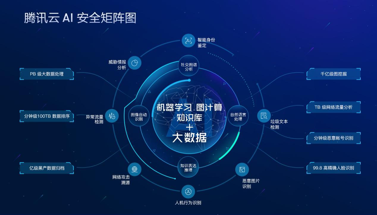 安全对抗是一场技术赛跑,利用AI的不法分子可以使用智能系统扫描,大数据信息拉取、人物画像描绘、基于画像的诈骗对话、智能密码破解、系统性DDOS攻击、模拟人脸、指纹、声纹获取利益,应对如此严峻的安全形势,腾讯云推出AI和大数据为驱动力,以云为平台和管道构建新一代智能安全防御体系,包括利用大规模图挖掘与机器学习追踪恶意团伙;通过人群画像与DNA建模,应对羊毛党与欺诈;整合多维度数据和威胁情报信息,通过机器学习,建立更加积极主动的态势感知系统。腾讯云AI安全能力矩阵图,以大数据、机器学习、图计算、知识库等当前热门AI技术为核心,驱动社交图谱分析、图像自动识别、知识表达推理、自然语言处理 4 大能力组合,形成智能身份鉴定、威胁情报分析、异常流量检测、网络攻击溯源、人机行为识别、恶意图片识别、垃圾文本检测等 7 项技术应用。