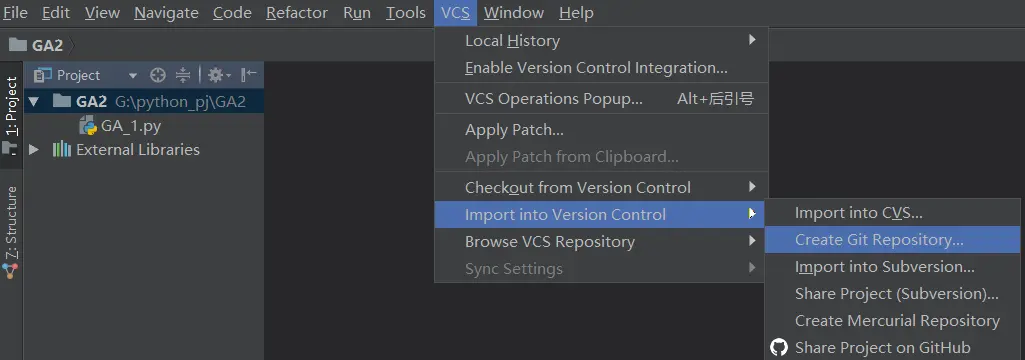 2、首先 VSC>import into version control>creat git repository,生成git仓库