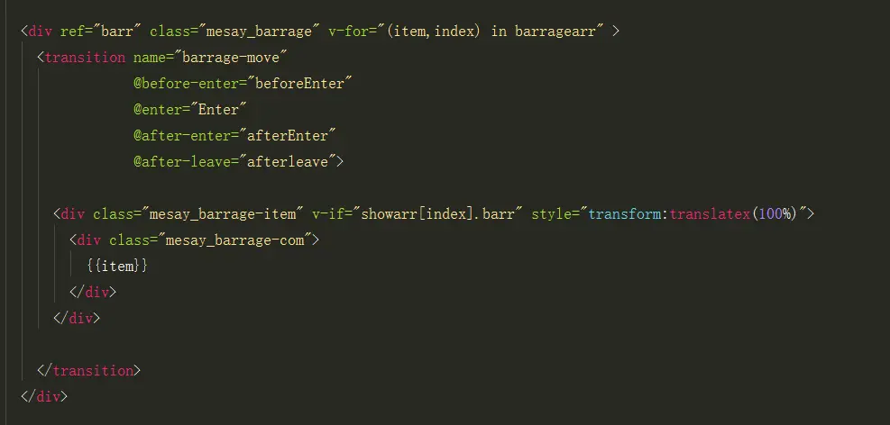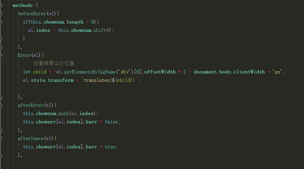 将弹幕包裹在transition标签内,并设置钩子函数。其中v-if="showarr[index].barr",控制弹幕的开关,
