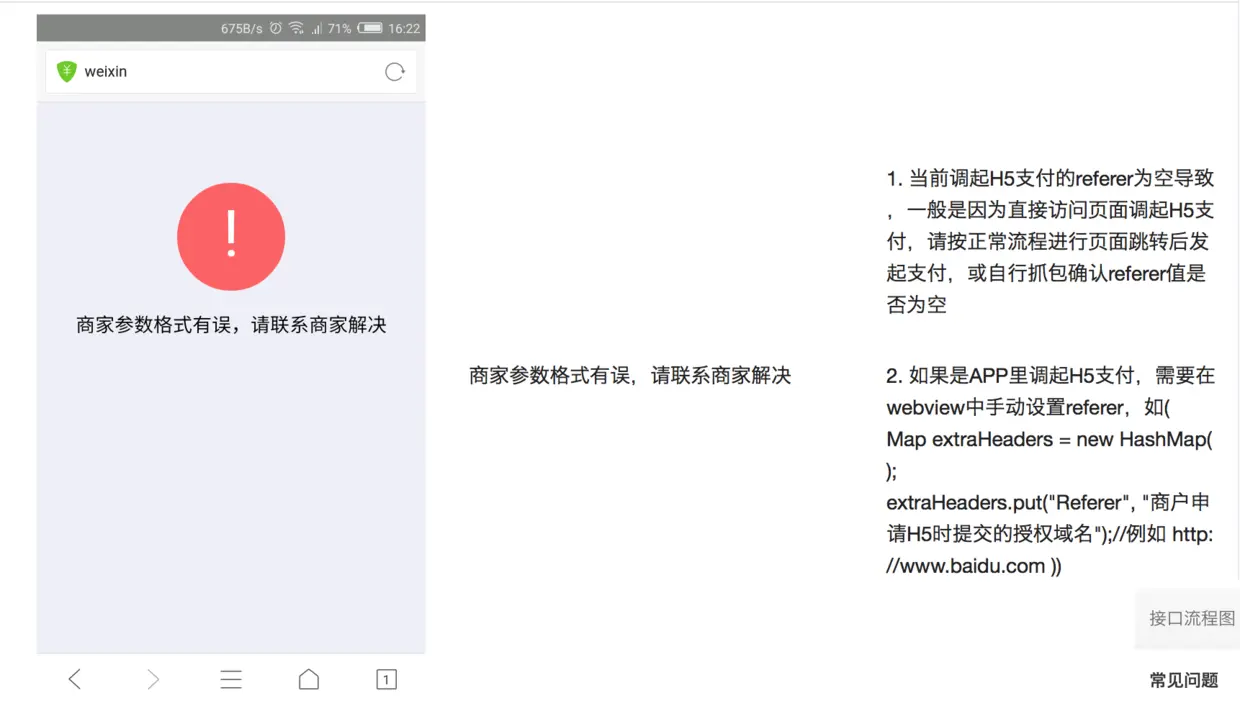 你以为这样就完了是吧,然鹅并没有,实际开发中很大机率会出现微信提示商家参数格式有误,请联系商家解决的问题,而且更尴尬的是:这个问题并不会 iOS 中出现,也不会 Android 浏览器中出现,偏偏就是在应用的 WebView 中出现了。