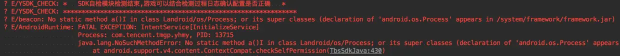 我们注意到,引发日志中引发 Crash 是在调用 checkSelfPermission 方法引发的,而异常内容是指向 android.os.Process ,这样看来只能从引入的 YSDK 上出发了,看看 SDK 中是不是有对系统 API 做了什么。