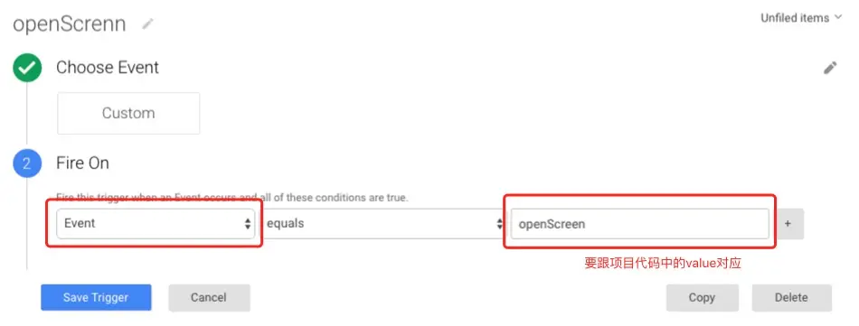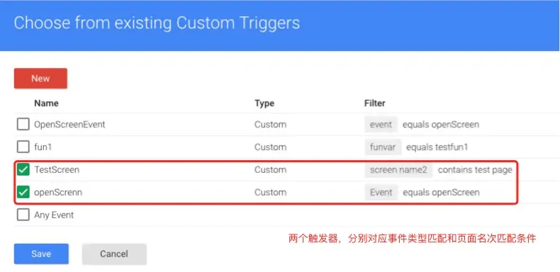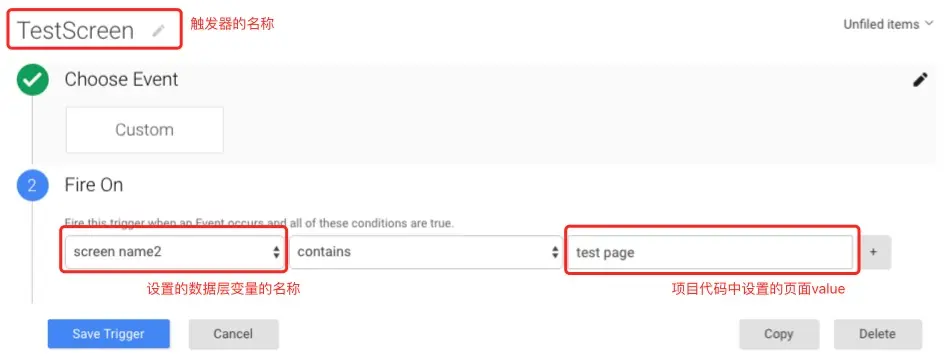 - 触发器TestScrenn: 管理界面变量screen name2中的数据层变量screen-name值等于test page时触发