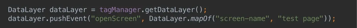 如上图,使用pushEvent(object)相当于push("event",object),表示向数据层push了一个key = “event”,value = “openScreen”和一个key = “screen-name”,value = “test page”的map对象集。这些数据层变量会映射到Google Analytiecs中成为触发的参数。