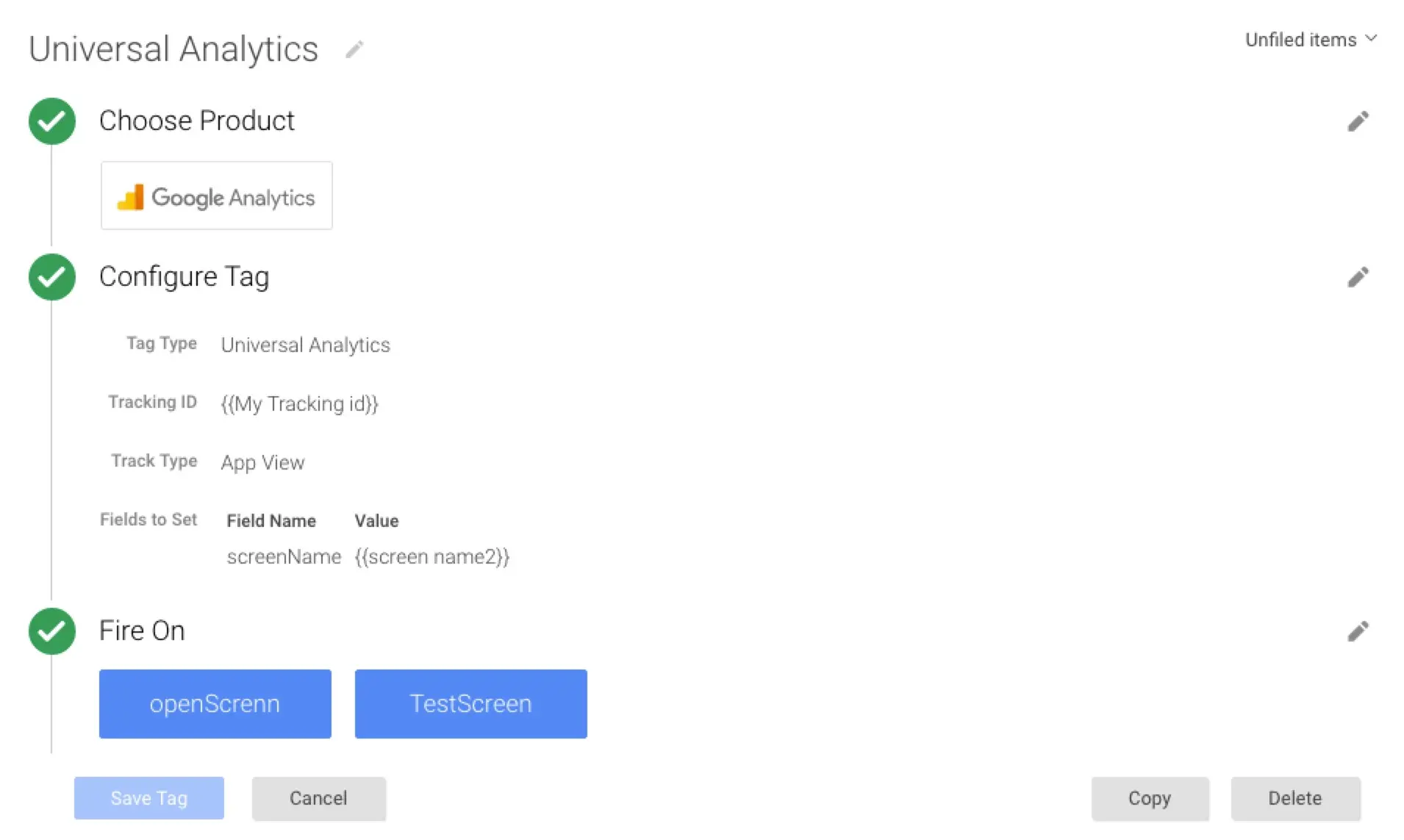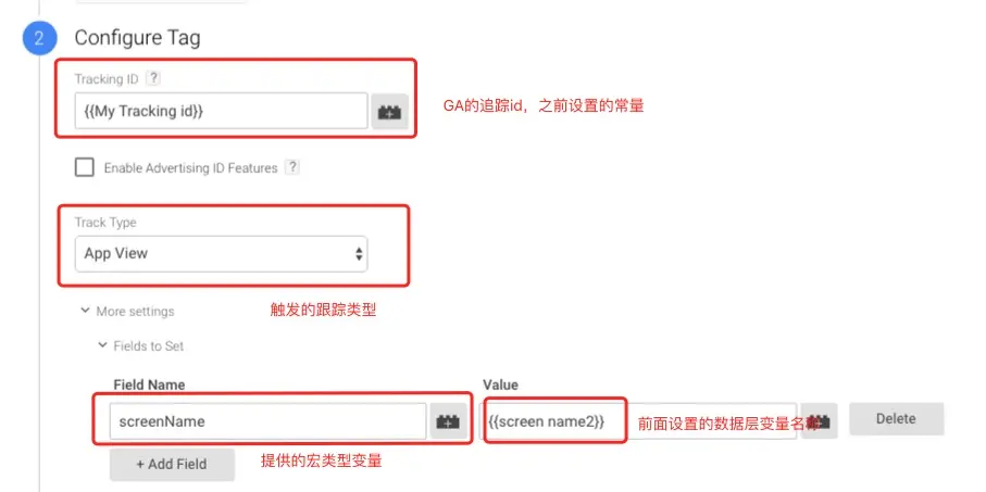 选择管理代码的产品类型,这里选择Google Analytiecs,择好后再配置tag相关信息,比如GA所需的tracking id,触发的事件类型为App View,触发GA统计方法时传入的参数screenName会替换成数据层变量screen name2的值。就是数据层变量的值映射到GA的方法参数。