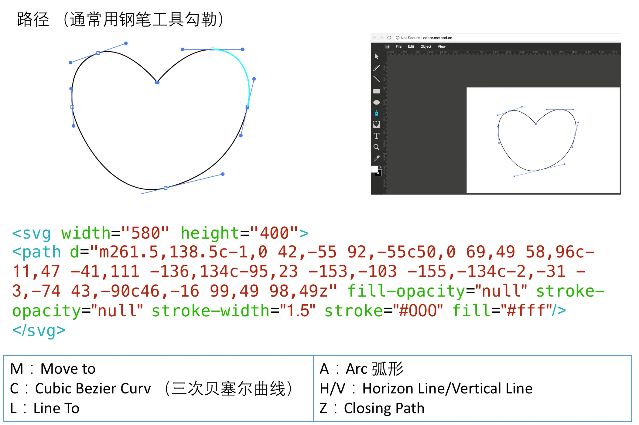 这个是用一个在线SVG画图工具来出来的,画完后会显示SVG代码。path里面可以使用贝塞尔曲线,它是一种很见的曲线,在CSS的animation也会用到,用来控制动画的速度: