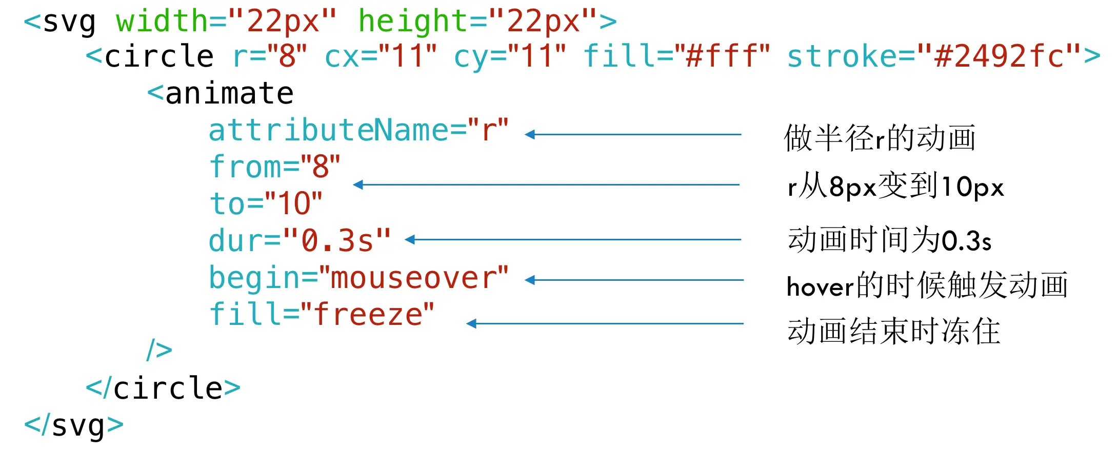 其中begin指定动画的开始时机,可以是indefinite表示无限循环,或者指定具体的秒数,又或者是在某个动画之后,还可以是事件如mouseover/click/mouseout等,上面使用mouseover,即hover的时候,半径会从小变成到大,如果希望鼠标移开后能缩回去,那么可以再加一个amimate,如下代码所示: