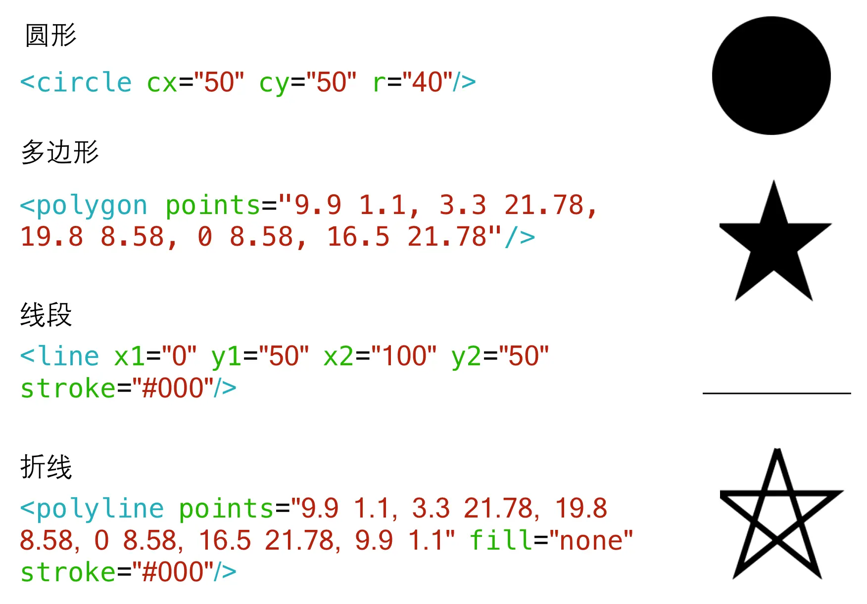 circle表示画一个圆,圆心在(11, 11),半径为8px,填充白色,描边为#2492fc,如果你设置fill="none",那么填充色就为透明色。相信很多人对SVG比较陌生,这里我简单介绍一下。除了circle,其它常用的画图标签元素如下图所示: