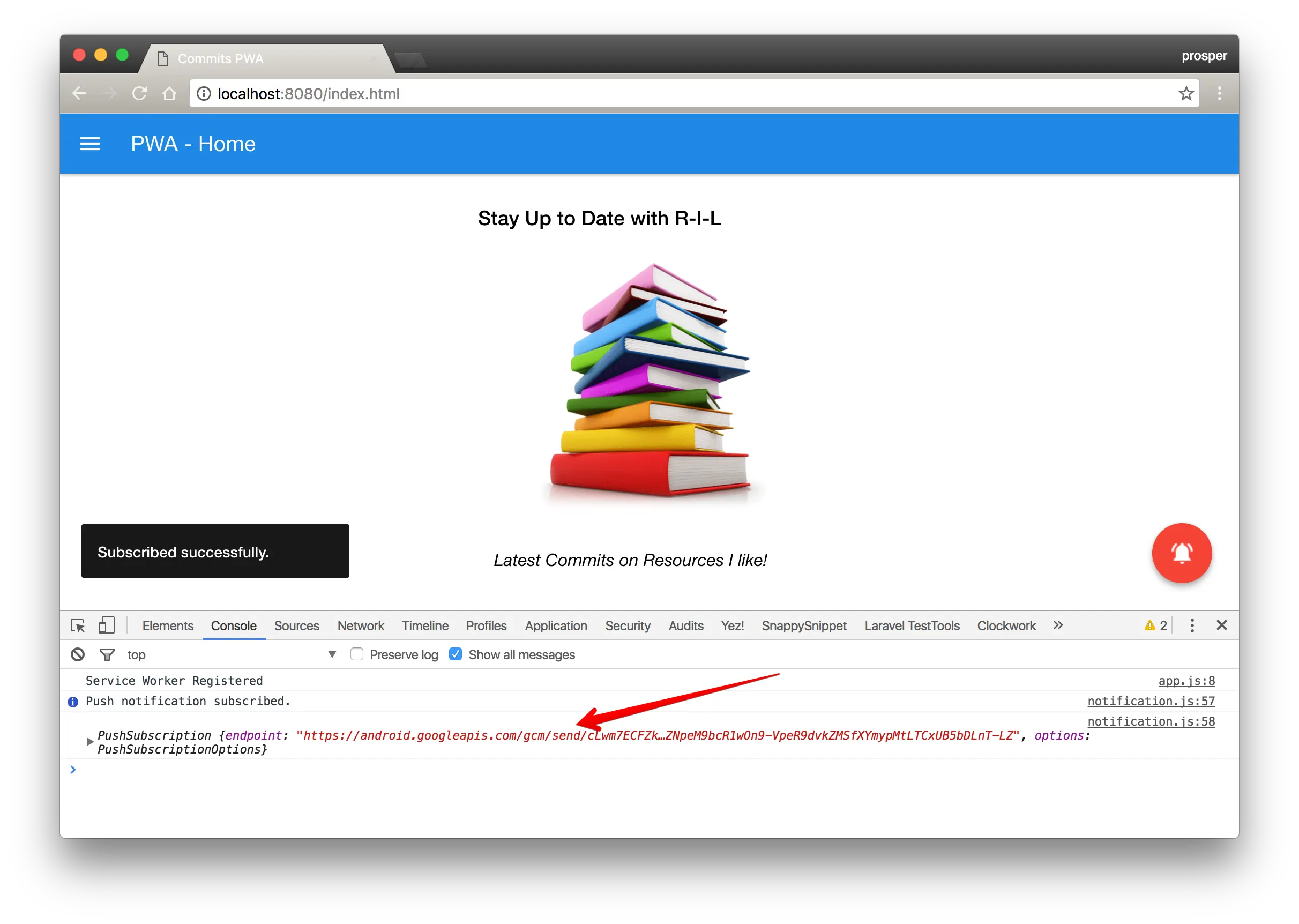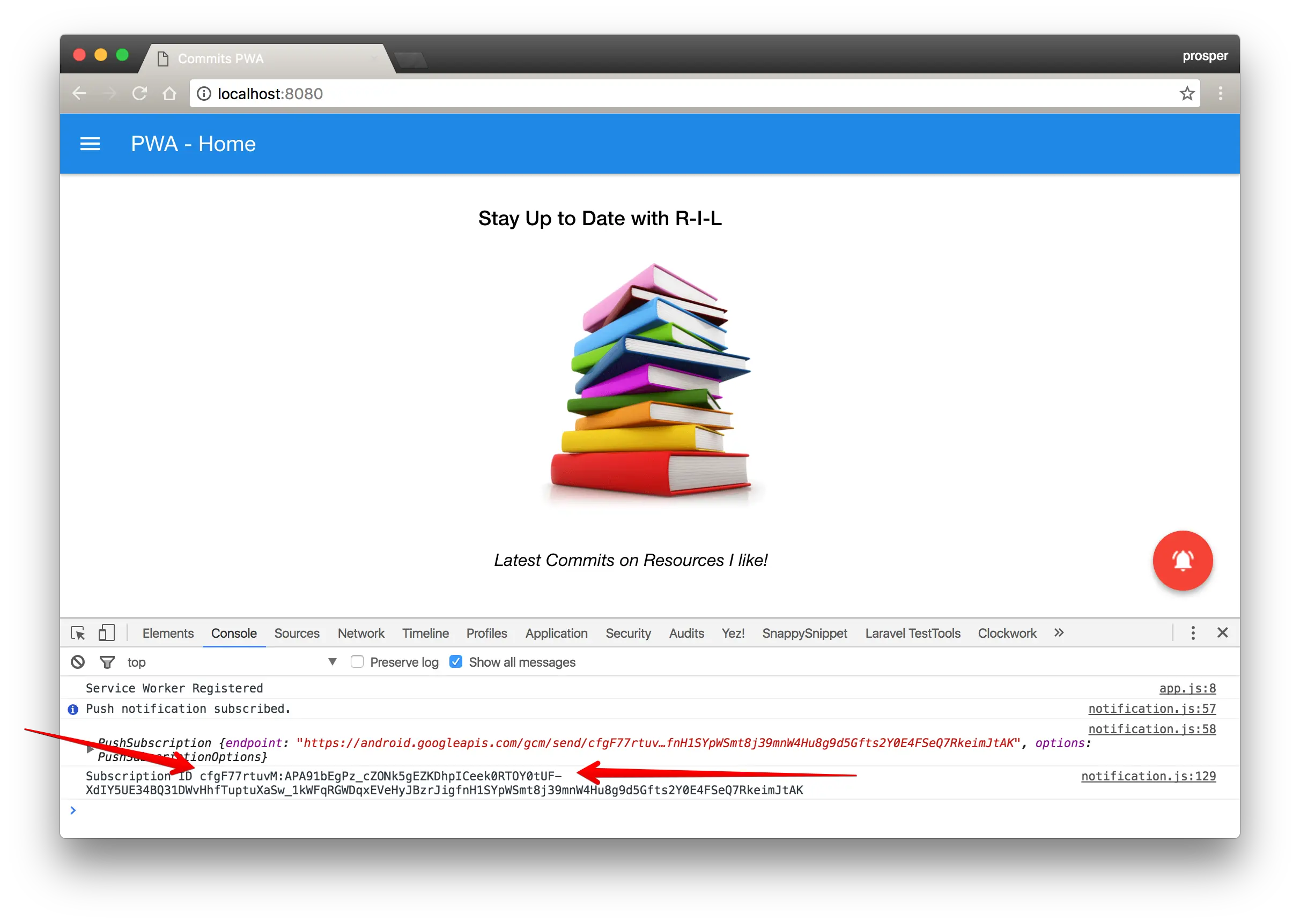 在我们的service API中,我们做一个POST请求到/api/notify的路由,然后后台接收到前端的请求继续推送到Firebase Cloud Messaging的服务中。现在,这还是不够滴,所以,我们还需要一种在浏览器中监听和接受此通知的方法。