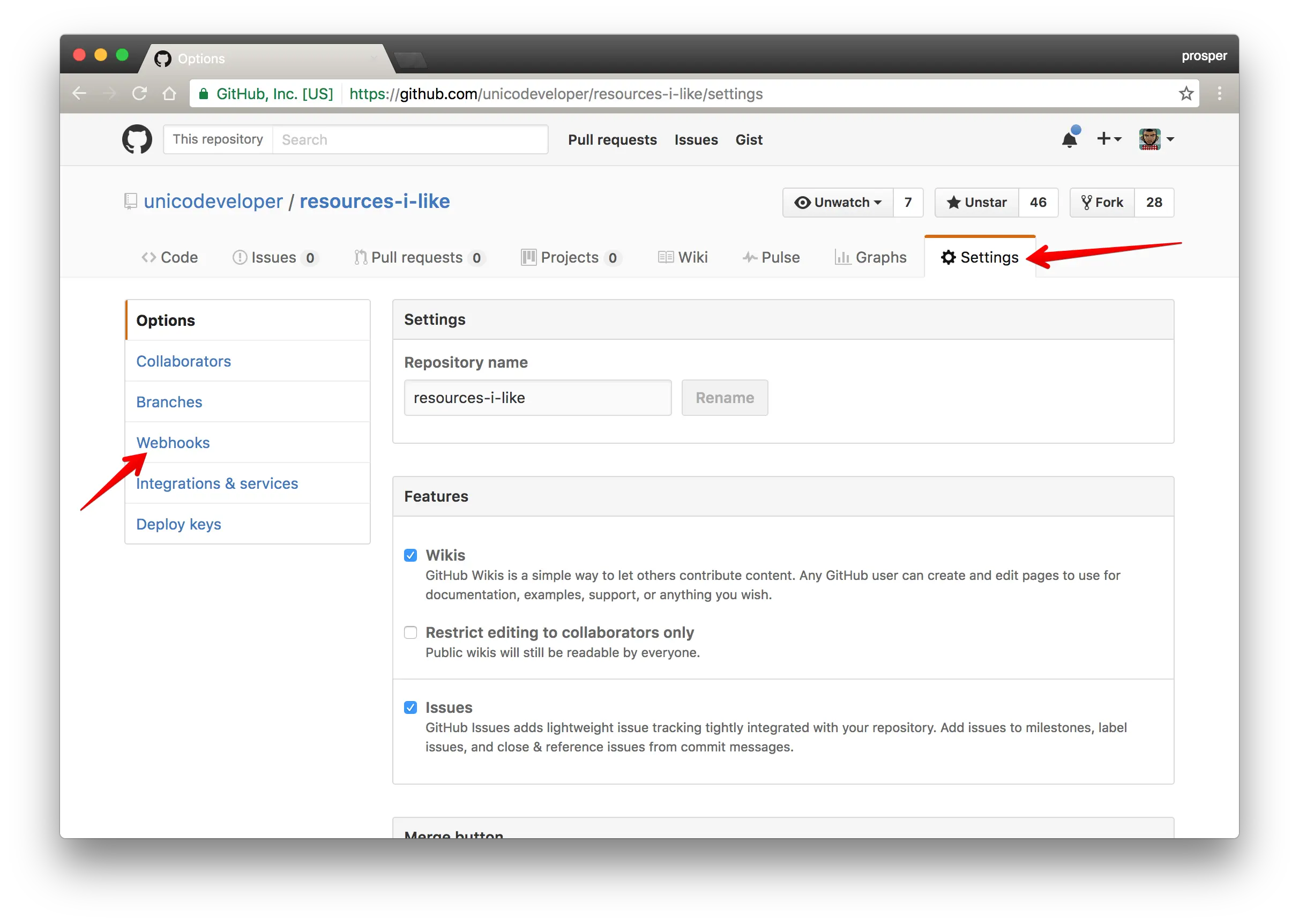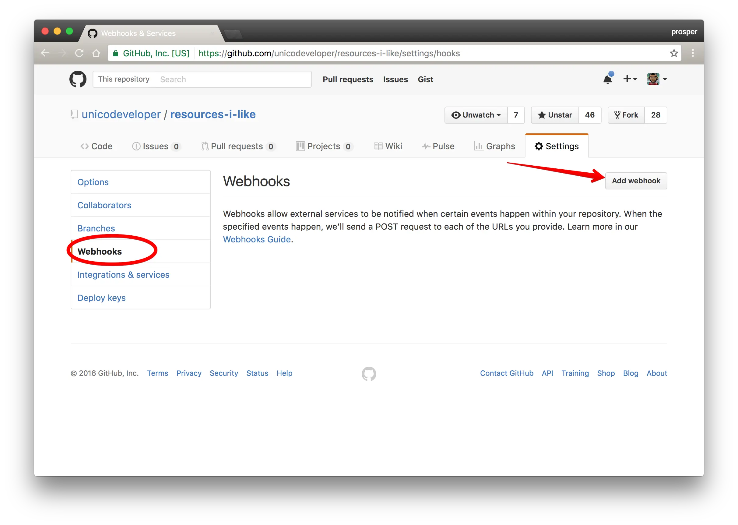 到你选择的仓库去,在这里我的是https://github.com/unicodeveloper/resources-i-like/,到 Settings > Webhooks中: