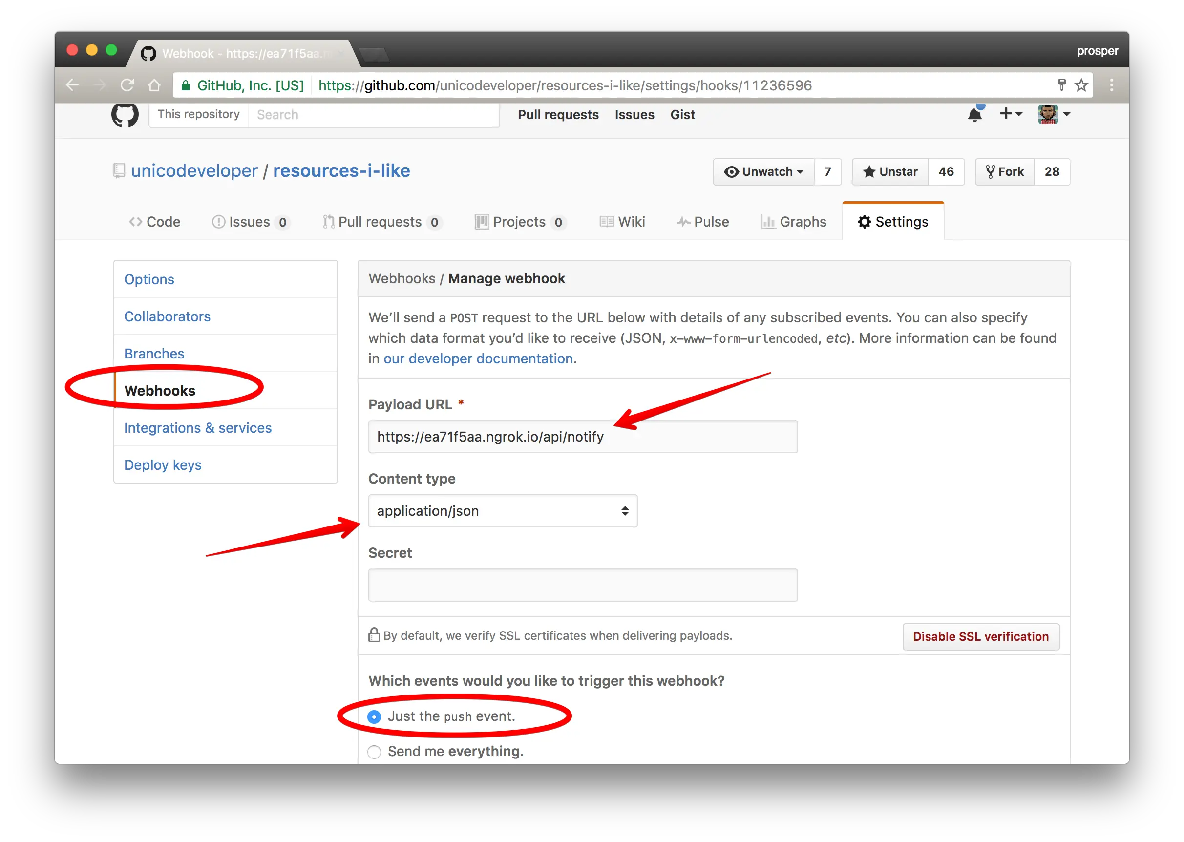之前我们是通过Postman手动发起一个请求去推送消息的,实际上,我们是想,用于一旦有了提交到https://github.com/unicodeveloper/resources-i-like/,我们就自动接收收到一个消息通知。那么,我们如何使这个过程自动化呢?