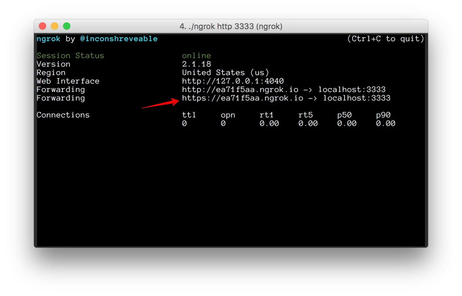 提示:ngrok输出HTTP和HTTPS地址,它们都映射到本地服务。
