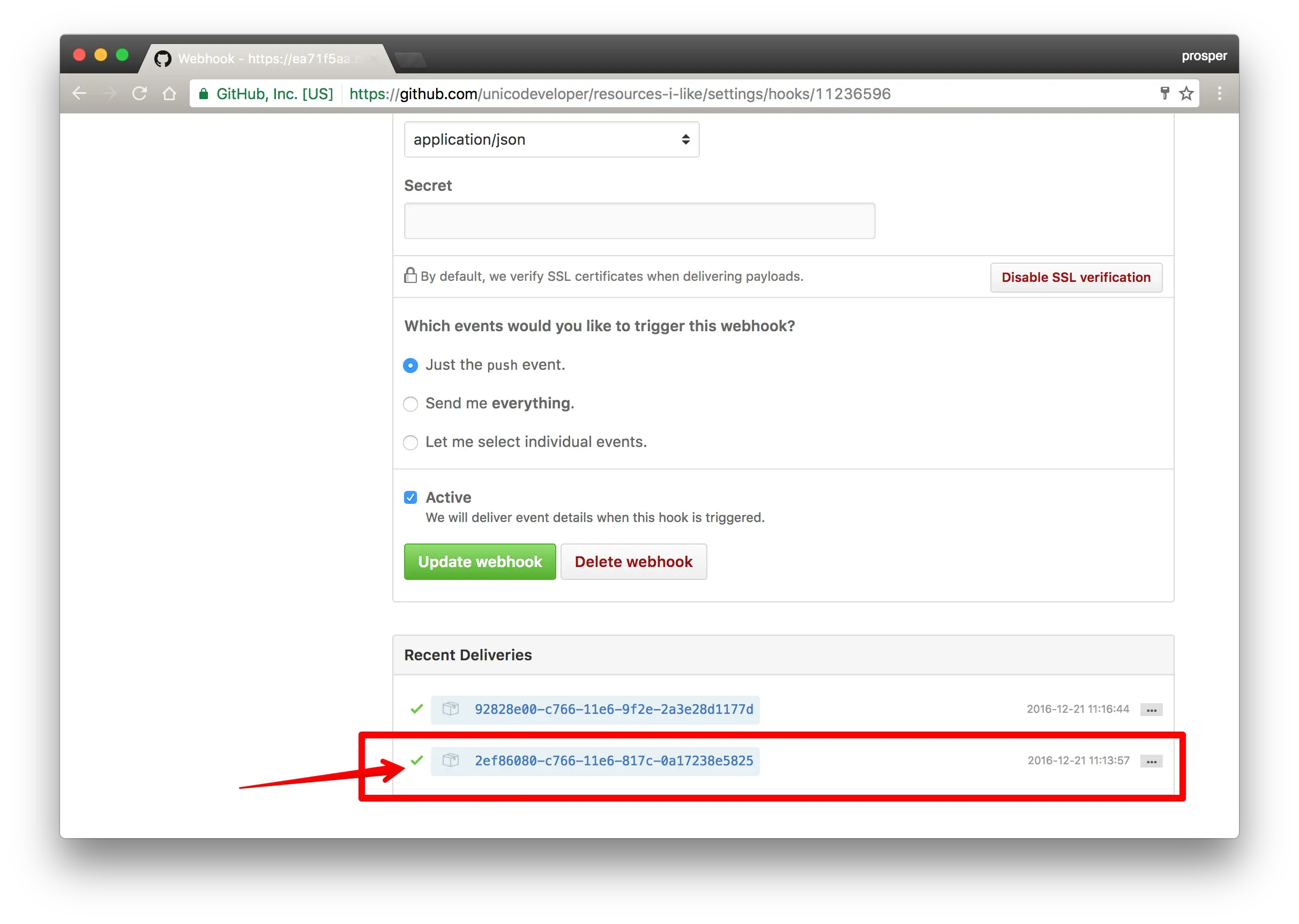 现在,一旦你添加webhook,GitHub立即提交测试post请求来决定是否设置正确。