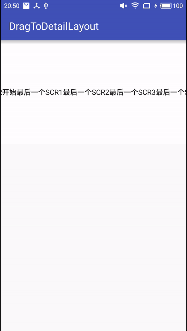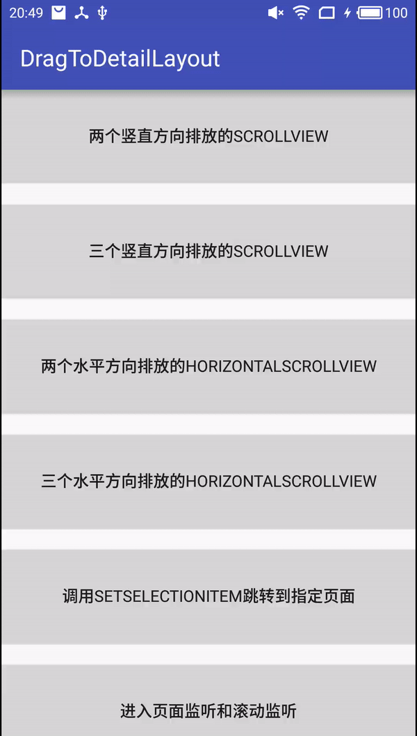DragToDetail中有关跳转到指定页面的原理,其实就是通过调用Scroller的startScroll,通过跳转的页面id计算出需要滑动的距离和跳转的方向,这里有一个需要注意的地方,从前向后跳的时候需要处理下中间跨度页面的滚动问题,因为如果不处理中间页面的滚动,那么跳转完页面后在回来,前面得页面可能无法滑动到底部,只能看到上半部分。这就是源码中之所以需要调用processEnd(View v)方法的原因。