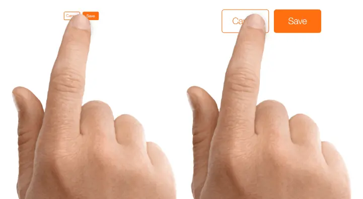- 交互元素的大小要合适。所有的交互元素(如链接,按钮和菜单)应该都是可以手势操作的。PC端网站适合交互区域(点击)较小且精确的方式,但移动网页需要较大的触发区,可以用拇指轻松完成。当网站经常需要用户操作时,请参考MIT Touch Lab的研究为您的按钮选择合适的尺寸。研究发现,手指面的平均尺寸在10到14毫米之间,指尖在8到10毫米之间,10×10毫米是一个很好的尺寸。