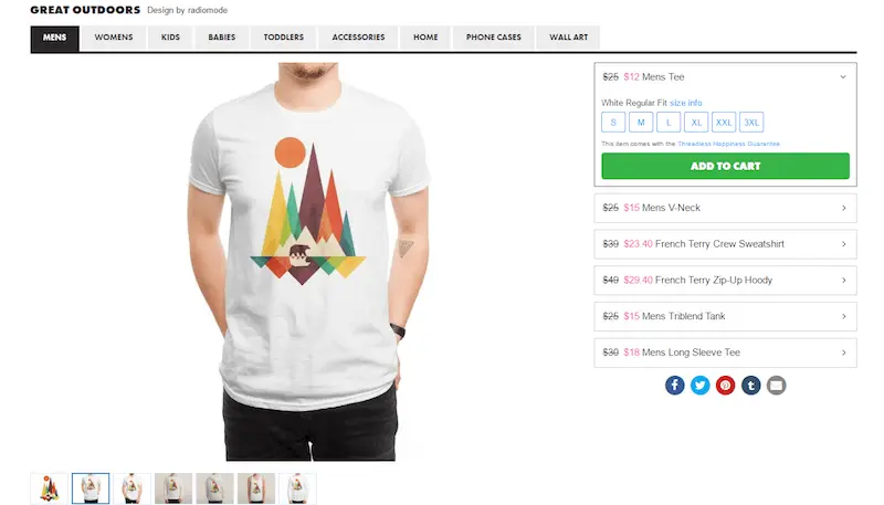 考虑两个例子 – 第一,Threadless,一个流行的T恤店。这个页面并没有多少关于正在销售的商品的信息 。唯一可用的文本信息是价格和大小的组合。