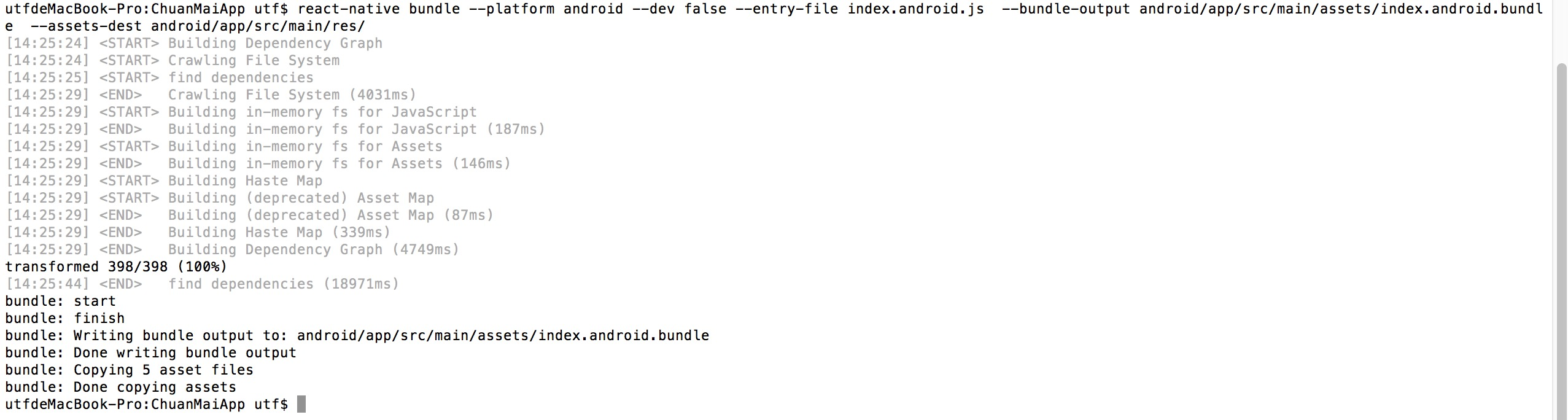 命令如下: react-native bundle --platform android --dev false --entry-file index.android.js --bundle-output android/app/src/main/assets/index.android.bundle --assets-dest android/app/src/main/res/
