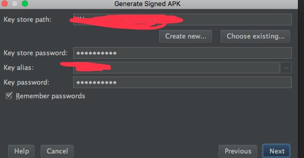 - 打开android studio Build -> Generate signed APK -> 配置好签名信息 ->打包