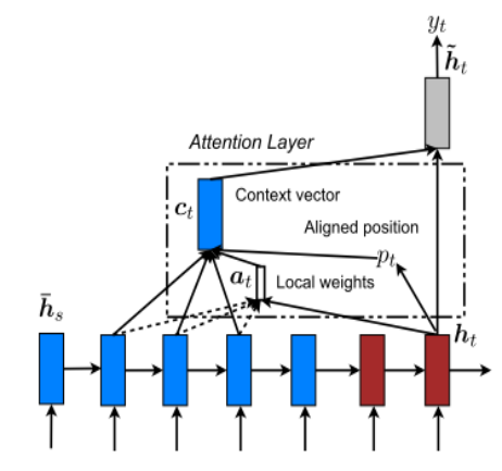 本篇论文提出了两种 attention (global attention 和 local attention),global attention 和最基本的 attention 类似,只是计算过程有所变化;local attention 只关注一个位置的 attention ,类似 one-hot 向量。