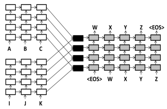 本篇论文最早提出了Encoder-Decoder框架,用于机器翻译领域。本文的亮点一方面在于对 source sentence 做了逆向输入的操作,另一方面相对于以往的论文,它将两个 RNN 结构连接在一起做翻译工作。