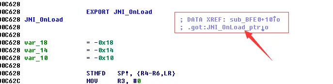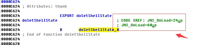 如下图显示,doSetShellState 被JNI_OnLoad +24 、 JNI_OnLoad+A0调用了,箭头方向表示引用位置的相对方向。