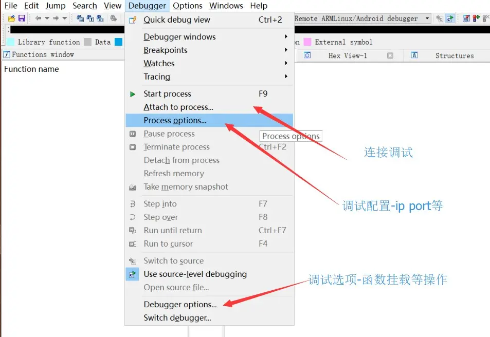 - Debugger options… 一些调试的选项,一般用于操作挂载JNI_Onload等