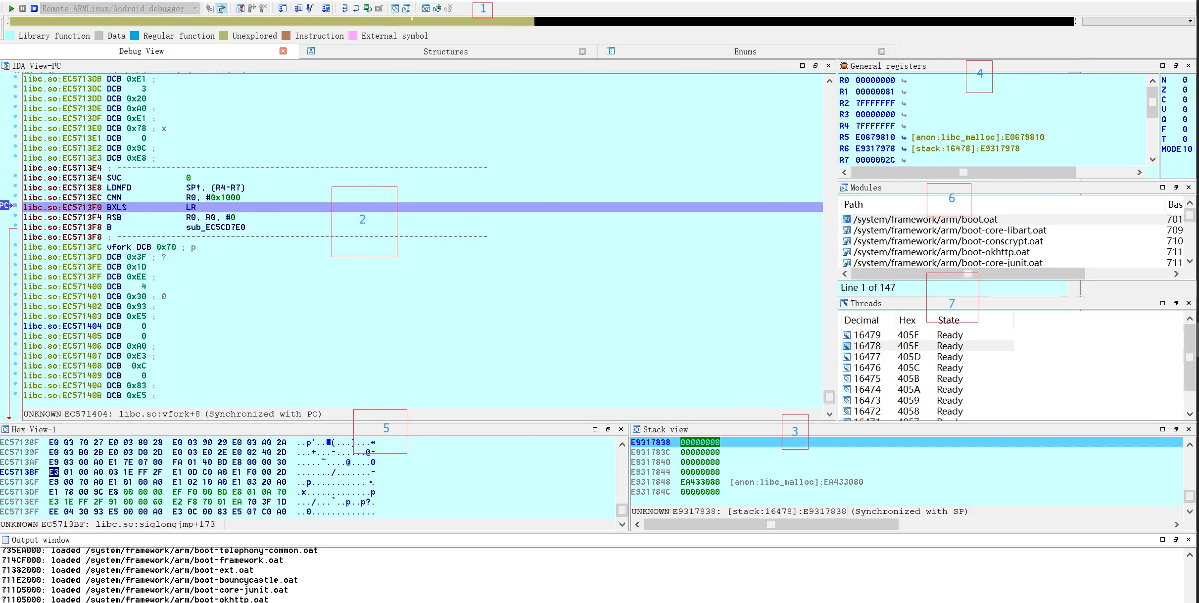 这个时候,我们就可以通过IDA 关联到调试进程了,IDA 启动调试,有两种界面: