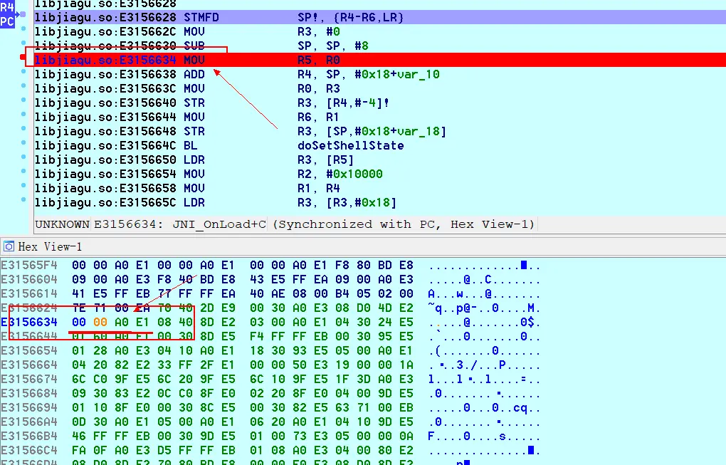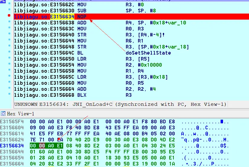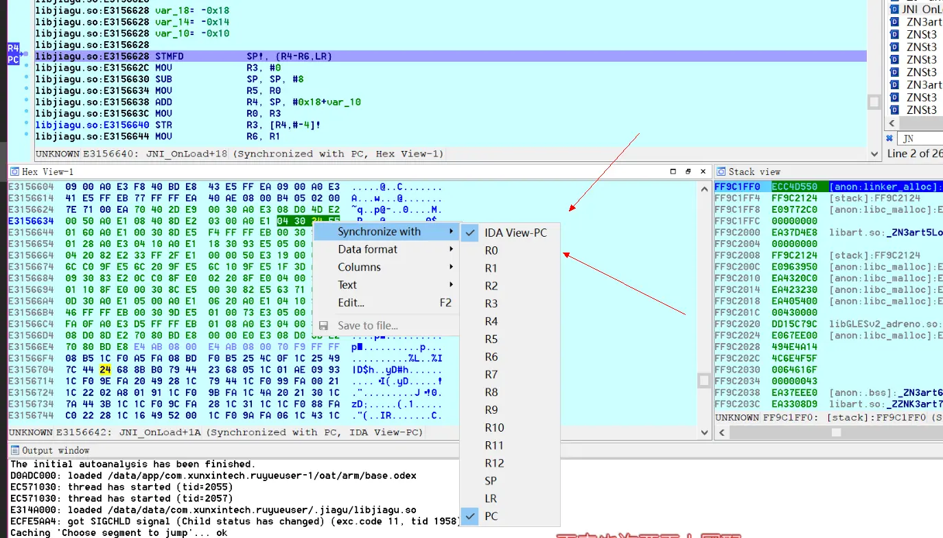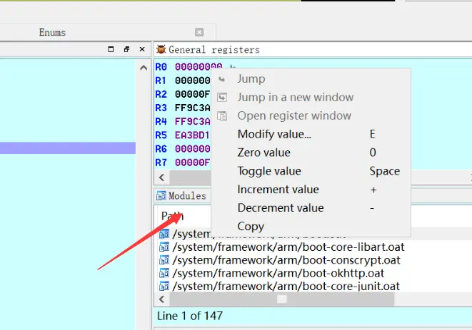 - Hex View-1 :十六进制窗口,与IDA View进行配套,通过右键可以调整数据展示,F2快捷键可以修改数据(常用于动态调试 nop 命令 – 00 00 A0 E1)。