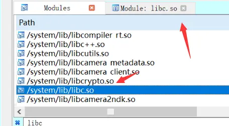 Modules窗口显示所有加载到进程内存空间中的可执行文件和共享库,双击任何模块名称,可将打开该模块导出的符号列表。(通过双击符号列表子项,可以跳转地址,常用于挂载函数)