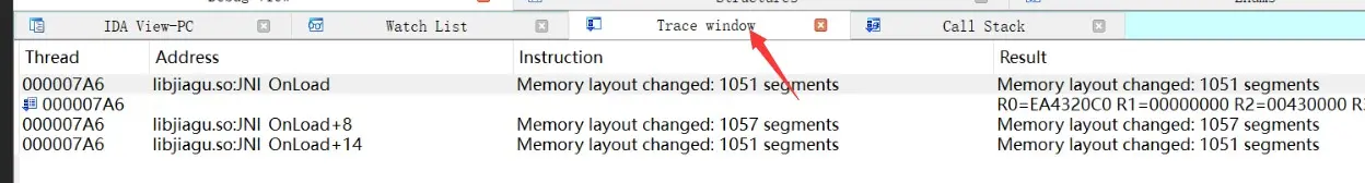 Debugger-Tracing-Instruction Tracing,IDA将记录被指令更改的地址、指令和任何寄存器的值。(指令跟踪将大大减慢被调试进程的执行速度,因为调试器必须单步执行这个进程,以监视和记录所有寄存器的值)