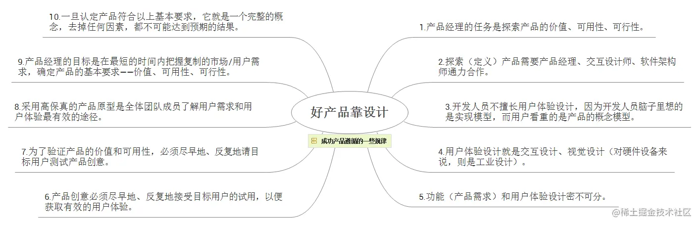 - 虽然需求调研和产品设计可以同步展开,产品开发和测试可以交叉进行,但是用户体验设计应该在软件开发前完成。