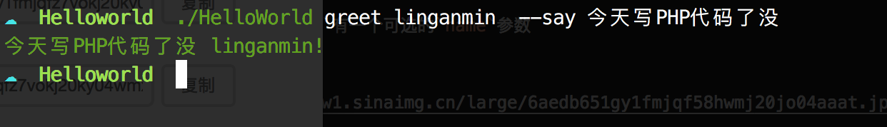 HelloWorld文件中(后面我将为每一行做注解),并在你的终端中执行HelloWorld这个应用程序.#!/usr/bin/env php <?php require __DIR__.'/vendor/autoload.php'; use Symfony\Component\Console\Application; use Symfony\Component\Console\Input\InputArgument; use Symfony\Component\Console\Input\InputInterface; use Symfony\Component\Console\Input\InputOption; use Symfony\Component\Console\Output\OutputInterface; (new Application('Hello World', '1.0.0')) ->register('greet') ->addArgument('name', InputArgument::OPTIONAL, 'Name of the person') ->addOption('say', null, InputOption::VALUE_REQUIRED, 'Custom greeting') ->setCode(function (InputInterface $input, OutputInterface $output) { $name = $input->getArgument('name'); $greeting = $input->getOption('say'); if (!empty($name) && !empty($greeting)) { return $output->writeln("<info>$greeting $name!</info>"); } else if (!empty($name)) { return $output->writeln("<info>Hello $name!</info>"); } else if (!empty($greeting)) { return $output->writeln("<info>$greeting World!</info>"); } else { return $output->writeln("<info>Hello World!</info>"); } }) ->getApplication() ->run();