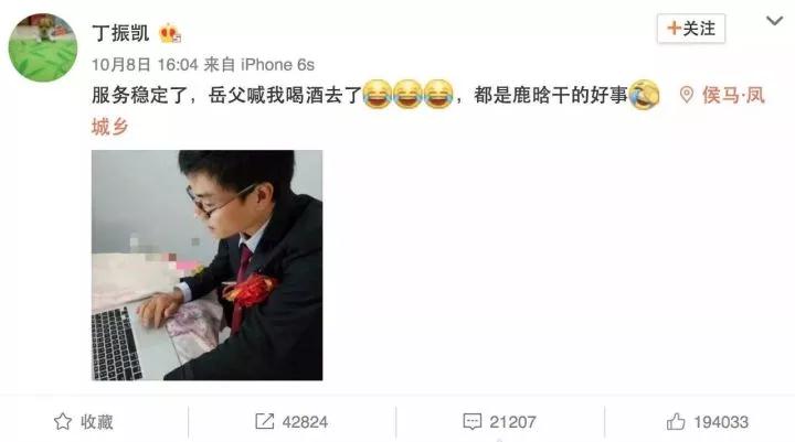 两人的恋情也让一位名为丁振凯的程序员火了,他是微博搜索的工程师,当天正好是他大婚的日子。服务器崩溃时他正在山西侯马举行婚礼,为了处理紧急情况,他不得不从酒席上离开,处理微博异常后才又返回继续婚礼……