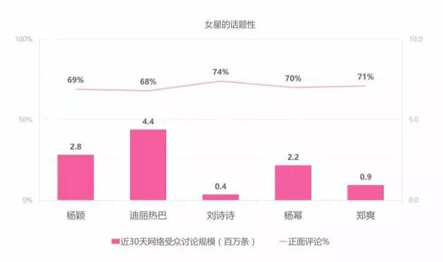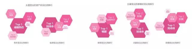 在女星中,迪丽热巴受众可能拥有车辆人群占比较高,而刘诗诗的受众中则为有房一族较多。单身男女偏爱杨颖、迪丽热巴;成家男女则追捧刘诗诗、杨幂、郑爽。