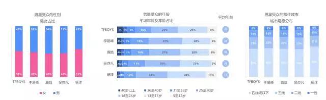 这是一个看脸的时代!男星受众的特征基本一致,男女比例对半开,年轻人占据主流,且城市分布差异化不大。