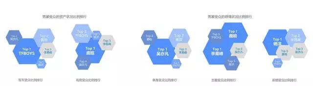 TFBOYS受众属有车一族在五位男星中的可能性最高,鹿晗的受众属有房一族的可能性最高。