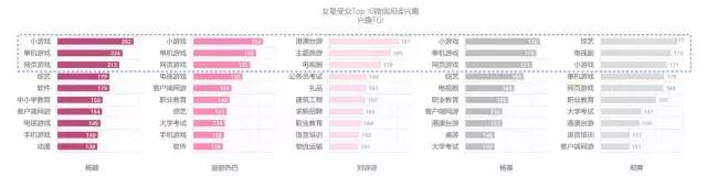 女星受众兴趣各不同,迪丽热巴、杨幂、杨颖的受众均为游戏爱好者;郑爽受众爱宅在家中看剧打游戏。