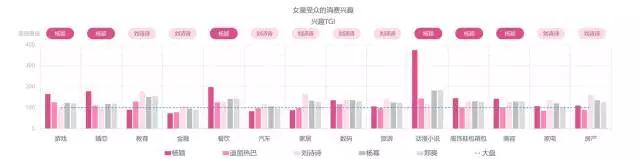杨幂受众更爱吃喝玩乐,尤为关注快消娱乐品;刘诗诗受众因年龄关系,则对教育、金融、汽车、家电等低频消费更感兴趣。综合来看女星受众比一般人群在消费领域更为突出。