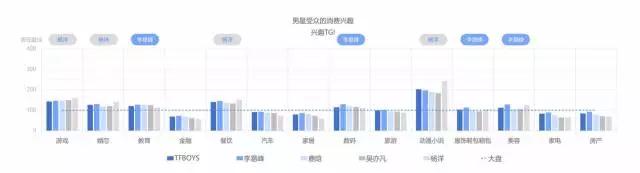 其中李易峰和杨洋受众兴趣更加广泛,且李易峰受众更偏爱数码、服饰、美容。