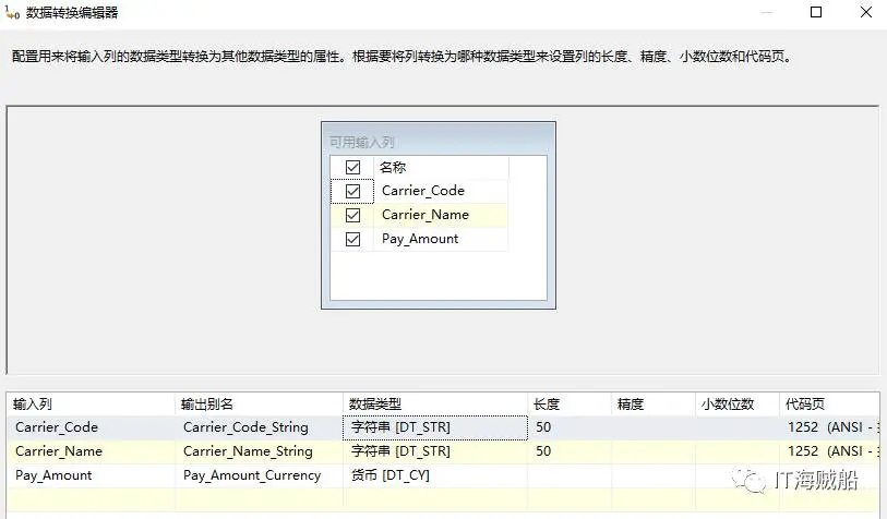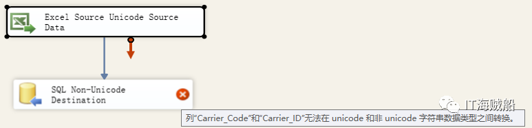 将Excel数据源导入到一个非Unicode字段定义目标表CARRIER_PAY中。因为默认情况下Excel数据会被导入为Unicode(右击Excel源,高级编辑—》输入属性和输出属性 可以看到数据被导成Unicode),而目标是非Unicode。所以目标映射的时候会提示数据不兼容。