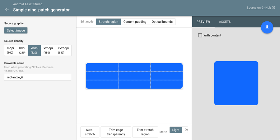 一键自动生成点九图,几秒钟就可以帮你把点九图做出来。终于不用重复看着教程做点九图了。只需打开这个网站,把图形扔进页面,就OK了。是不是很神奇?