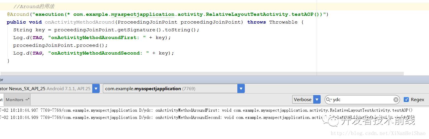 @Around("execution(* com.example.myaspectjapplication.activity.RelativeLayoutTestActivity.testAOP())") public void onActivityMethodAround(ProceedingJoinPoint proceedingJoinPoint) throws Throwable { String key = proceedingJoinPoint.getSignature().toString(); Log.d(TAG, "onActivityMethodAroundFirst: " + key);